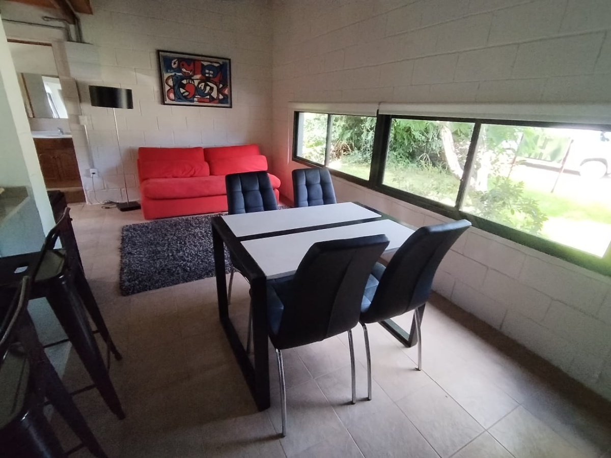 Cocina integrada con mesa y sillas, sillón adicional que se puede usar para dormir.