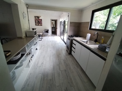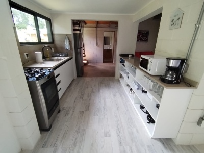 Cocina equipada con microondas, heladera con freezer, cafetera, licuadora, mixer y tostadora.